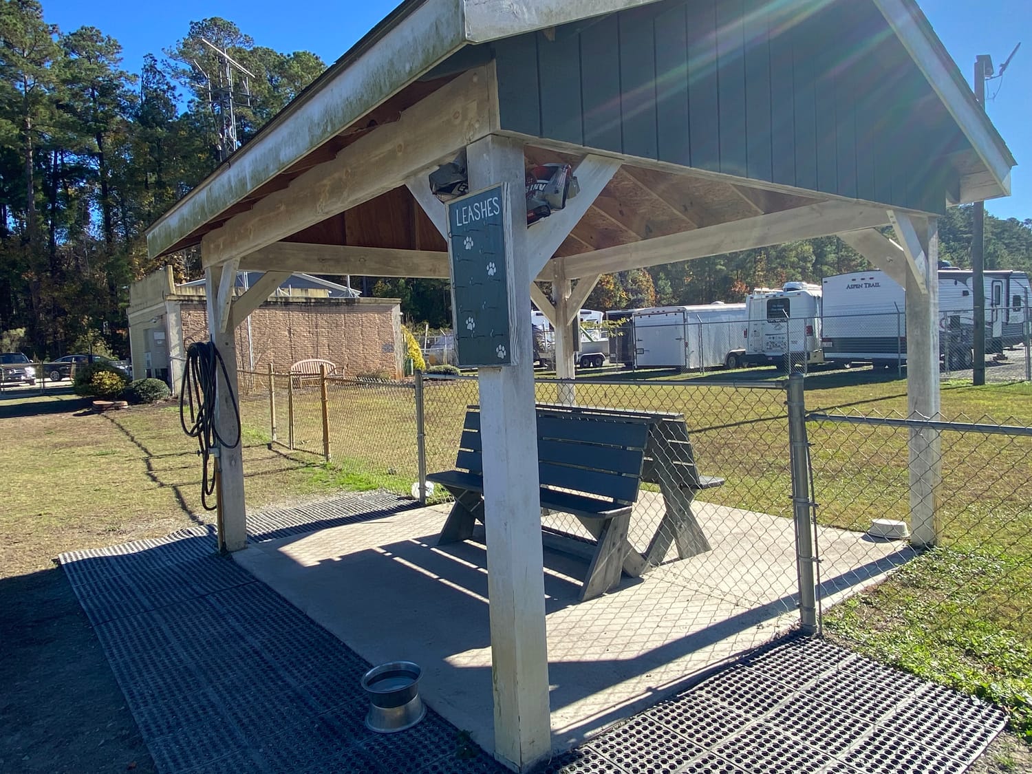 Each area has a double gate for leashing up with gravel substrate. Play areas are flat and grassy. Water is available. Sun shelter is split along the common fence of both dog areas.