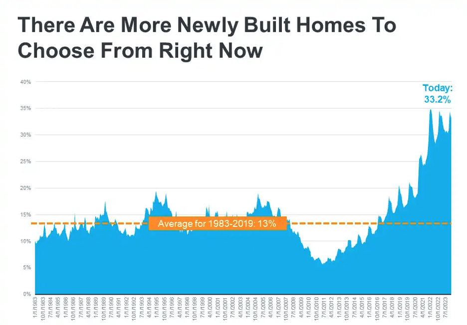 From 1983 to 2019 (the last normal year in the market), newly built homes made up only 13% of the total inventory of homes for sale. But today that number has climbed to over 33%.
