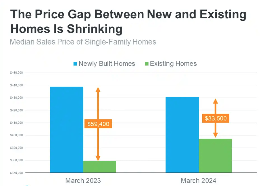 “While new builds are still sold for slightly more than existing homes, the price gap has significantly narrowed . . .”