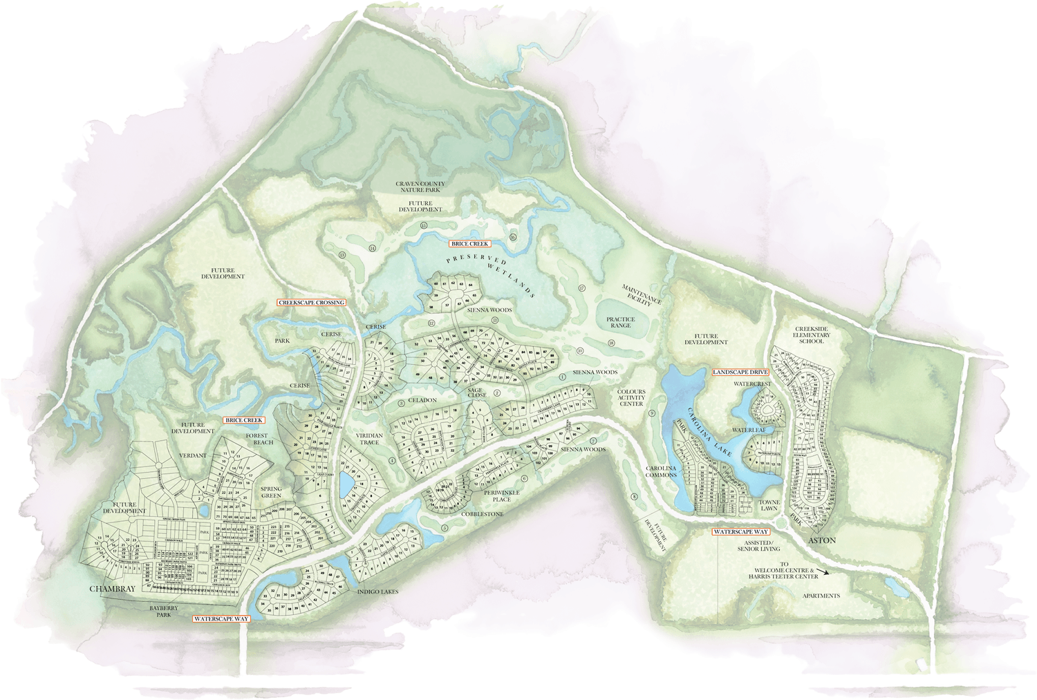Carolina Colours is an idyllic community because of its location, accessibility, beauty, amenities, and active lifestyle. These characteristics attract both retirees and those wanting to find a great place to raise a family. The pedestrian and pet-friendly neighborhoods encourage walking and bike riding. Home sizes, styles, and floor plans are available to satisfy most tastes and budgets. Set within a natural, rolling and wooded site, augmented with creeks, ponds, lakes, and forests, little had to be artificially created.