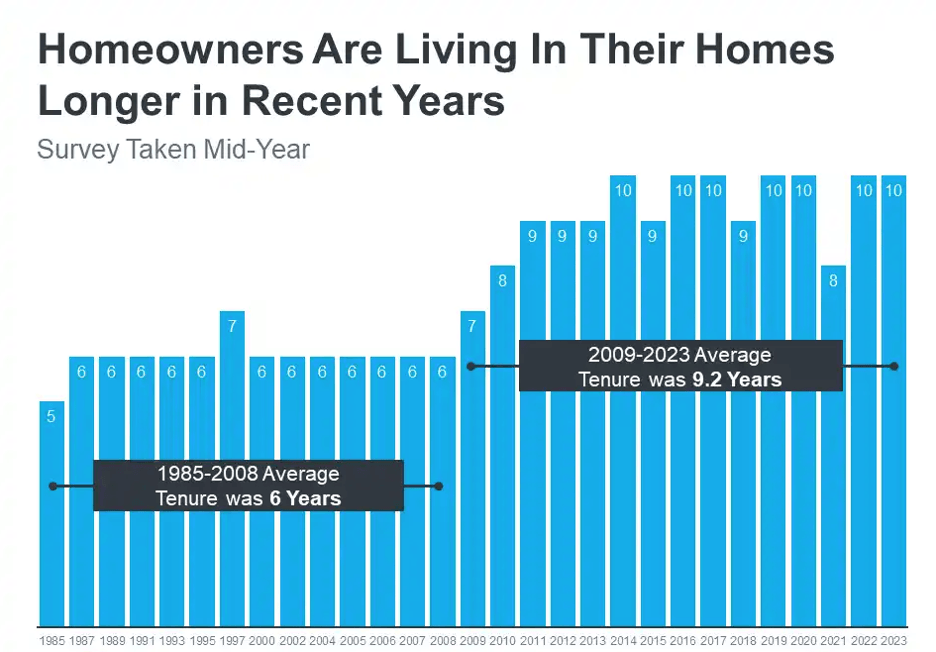 From 1985 to 2008, the average length of time homeowners typically stayed in their homes was only six years. But according to the National Association of Realtors (NAR), that number is rising today, meaning many homeowners are living in their houses even longer (see graph below):