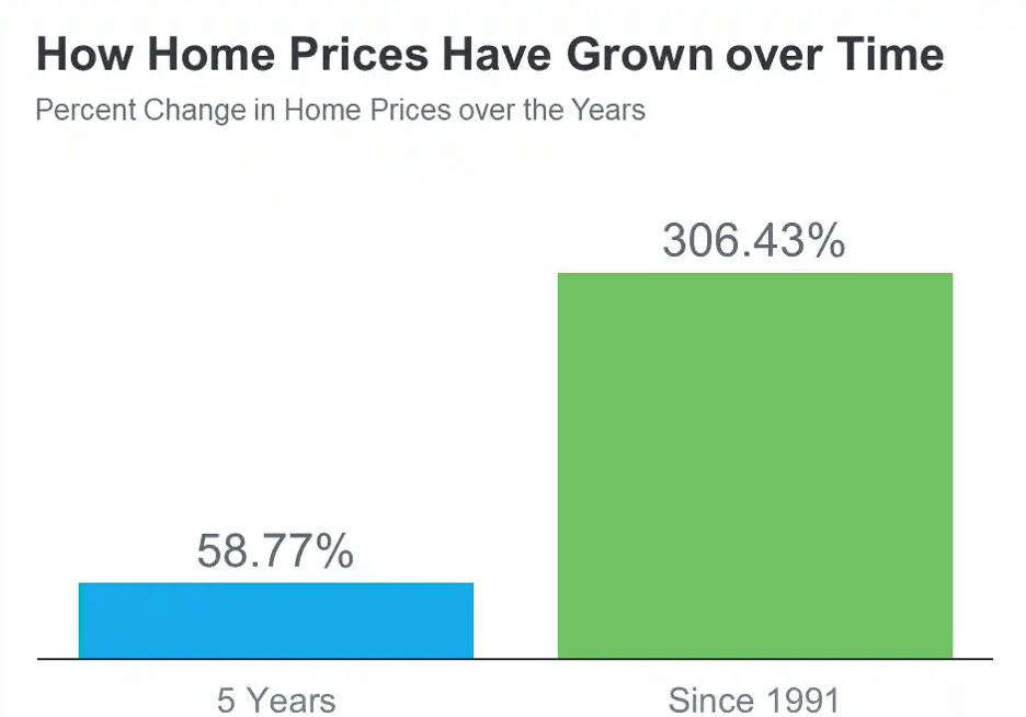 While home price growth varies by state and local area, the national average shows the typical homeowner who’s been in their house for five years saw it increase in value by nearly 60%. And the average homeowner who’s owned their home since 1991 saw it more than triple in value over that time.