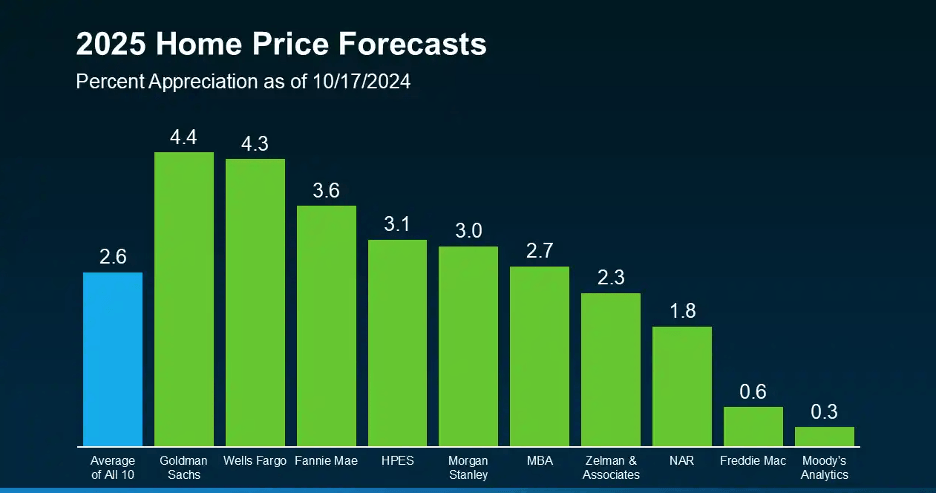 Experts are saying home prices will grow by an average of about 2.5% nationally in 2025 (see graph below):