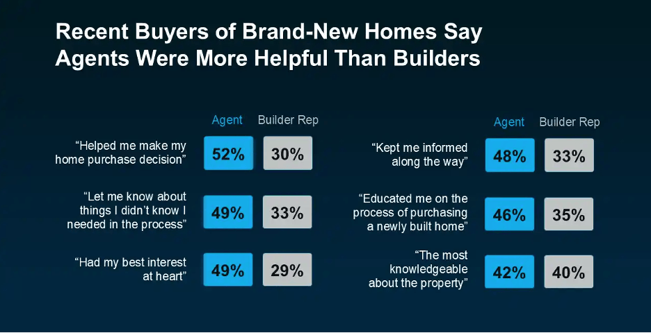 Maybe that’s why data shows homebuyers unanimously scored their agents higher than their builders when looking back on their recent purchase: